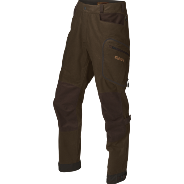 Härkila Mountain Hunter Housut ovat kevyet ja kestävät miesten kuorihousut, jotka on kehitetty aktiiviseen metsästykseen tuntureilla. Housuissa on kulutusta kestävät CORDURA®-vahvikkeet kaikkein alttiimmissa paikoissa sekä tuulen- ja vedenpitävä GORE-TEX®-kalvo auttamassa selviytymään tunturien korkeuksissa usein vaihtelevasta säästä. Mountain Hunter -takin tavoin myös Mountain Hunter -housut on valmistettu äänettömästä, harjatusta trikoomateriaalista. Materiaalissa on DWR-käsittely, eli Durable Water Repellent, joka tekee housujen pinnasta likaa ja vettä hylkivän. Housujen sisäpuolella on verkkovuori, joka johdattaa kosteuden pois keholta. Kahden etutaskun lisäksi Mountain Hunter -housuissa on kaksi lahjetaskua vesitiiviillä vetoketjuilla sekä panospidike oikeassa lahjetaskussa. Lisäksi housuissa on nailonista valmistetut säätöhihnat lahkeensuissa sekä säätöhihnat polvien takana. Näin voit helposti saada lisätilaa polvien ympärille, mistä on hyötyä metsästäessäsi tuntureilla ja halutessasi saada kunnon liikkumavapauden. Housujen vyötärökaitaleen vasemmalla puolella on D-rengas erilaisten varusteiden kiinnittämistä varten ja reiden takapuolella on verkkovuoratut ilmanvaihtoaukot vesitiiviillä vetoketjuilla.