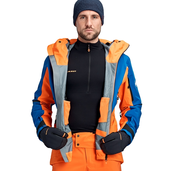 Mammut Nordwand Pro Hs Hooded Jacket Men on kestävä miesten kuoritakki ääriolosuhteisiin. Hiihtotakki on valmistettu Gore-Tex® Pro -kankaasta, jossa on ”most robust” -teknologia, joka tarjoaa täydellisen yhdistelmän sääsuojaa ja kulutuskestävyyttä. Siinä on myös vyöhykepintaiset Gore-Tex®-venytyskankaasta valmistetut insertit, jotka antavat lisää liikkumisvapautta, ja 8 mm:n Gore-SEAM®-teipatut insertit (vyöhykkeittäin) saumojen minimoimiseksi. Kehräämällä värjätty selkä- ja pintakangas lisäävät kestävyyttä, kun taas säädettävät hihansuut sopivat hanskoihin ja niissä on laadukkaat Hypalon-koukkukiinnikkeet. Takissa on myrskynkestävä, kypärän kanssa yhteensopiva huppu, joka on helppo säätää pysty- ja vaakasuunnassa myös hansikkaita käytettäessä. Cohaesive®-tulpilla varustettu yhdellä kädellä säädettävä kiristysnauha takaa tarkan helman ja hupun säädön, ja sitä voidaan käyttää myös hanskoja käytettäessä. Takissa on irrotettava lumihame, jossa on liukumaton pito ja kaksoispainikekiinnitys yksilöllistä säätöä varten, ja siinä on pehmeä mikrofleece-leukasuoja, rintatasku, jossa on vettähylkivä vetoketju, vedenpitävä YKK VISLON® 2-suuntainen etuvetoketju ja vetoketjullinen rinnan sisätasku. Kaksi vedenpitävää, kiipeilyvaljaiden kanssa yhteensopivaa ulkotaskua, kaksi suurta sisätaskua, hihatasku vedenkestävällä vetoketjulla ja kainalotuuletus vedenkestävällä vetoketjulla täyttävät kaikki mahdolliset tarpeet.