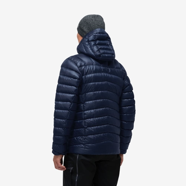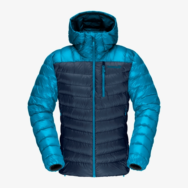 Kompromisseja tarjoava miesten kevyt hupullinen untuvatakki topptur-retkille.