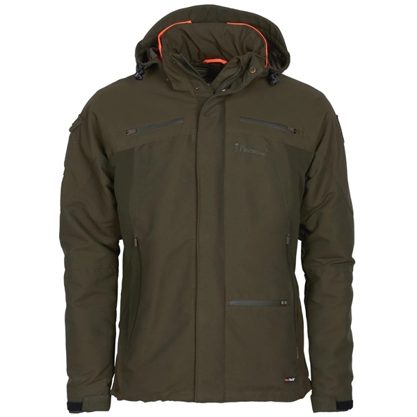 Pinewood Hunter Pro Xtreme 2.0 Jacket on kestävä, tuulenpitävä ja vedenpitävä metsästystakki, jossa on kalvot ja teipatut saumat. Takissa on erityisen joustavan kankaan paneelit, joissa kangas kiristyy liikkeessä, mikä lisää hiljaisuutta ja miellyttävää joustavuutta liikkeessä. Sivuilla on verkkovuorauksella varustetut tuuletusaukot, jotka on helppo avata vetoketjulla, joka avoimessa asennossa lisää ilmankiertoa ja tuuletusta. Tämä tuuletus lisää käyttömukavuutta korkeammilla aktiivisuus- ja lämpötilatasoilla ja vähentää kosteuden kertymistä. Kaulus on hieman korkeammassa mallissa, joka suojaa kaulaa ja kasvoja tuulelta ja kylmältä, ja se on merkinoranssi lisänäkyvyyden takaamiseksi. Tässä takissa on useita käteviä etutaskuja, tilava takatasku ja integroidut henkselit. Irrotettava ja säädettävä huppu sekä säädettävät hihansuut, joilla on mahdollisuus tiivistää tuulta vastaan entisestään ja optimoida istuvuus. Molempiin rintataskuihin on saatavana radioaukot, jotka sopivat sekä oikea- että vasenkätisille ampujille ja ovat käteviä niille, jotka haluavat säilyttää takissa sekä radiota että GPS:ää tai muita varusteita.