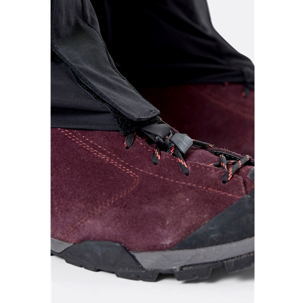 Rab Trek Gaiter Wmnsovat kevyet naisten gaitersit, jotka tarjoavat kestävää suojaa kiviä, vettä, mutaa ja lunta vastaan, kun olet pitkillä vaelluksilla tai monipäiväisillä retkillä vaihtelevissa sääolosuhteissa. Suojat ovat valmistettu kestävästä mutta joustavasta materiaalista jossa on vahvisteet nilkoissa ja niissä on istuvuutta parantavat remmit jotka parantavat säärystimien pitoa vaelluskenkien ympärillä. Gaiterit ovat myös varustettu DWR-pinnoitteella joka tekee niistä erityisen hyvin vedenpitävät, ja minimoitu saumarakenne ja sulkumekanismi ilman vetoketjua tekee niistä helppokäyttöiset. Säärystimet ovat ylhäältä säädettävät kiristysnaruilla, ja alempi hihna on varustettu turvallisella, sisäisellä säätömekanismilla, joka tarjoaa mukavuutta ja kestävyyttä.