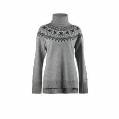 Scandinavian Rollneck Neulottu villapaita naisten mallissa, jossa on korkea, ihanan lämmittävä kaulus. Perinteisten pohjoismaisten kuvioiden innoittamana. Puserossa on kylkineuleet hihansuissa ja SKHOOP-logo vasemmassa hihassa. Pusero on takaa hieman pidempi ja siinä on halkiot sivuilla