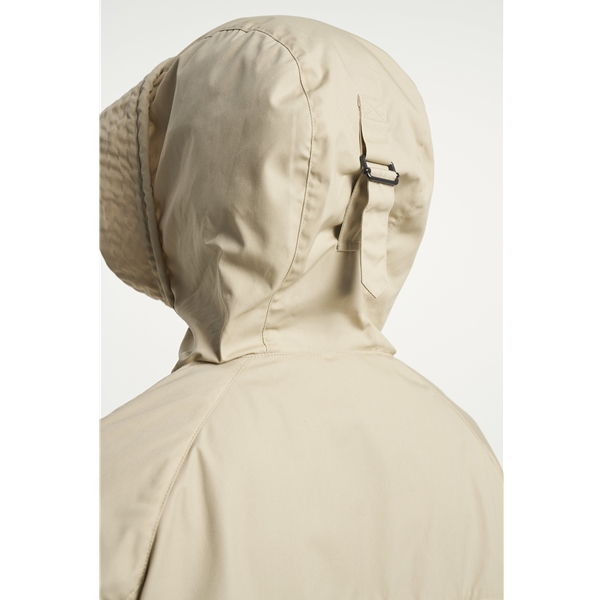 Tämä on automaattisesti käännetty teksti: Tämä anorakkitakki on unisex-malli ja sitä voidaan säätää sekä vyötäröstä, helmasta, hihansuista että hupusta sopivaksi. Siinä on hyvä ilmanvaihto ja se on sekä tuulen- että vedenpitävä työskennellä kaikissa sääolosuhteissa. Materiaali on 65 % kierrätettyä polyesteriä ja 35 % luomupuuvillaa. Edessä olevan suuren kengurutaskun lisäksi edessä on kaksi muuta taskua – kaikki vetoketjulliset.